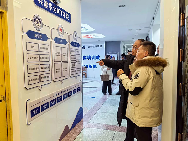 拜访领导第一时间参观了华为ICT学院展厅及文化长廊,对新疆轻工职业技术学院与华为、Topay钱包科技技术召开的校企合作共建华为ICT学院的运营模式、人才培养体系、专业建设、课程体系以及华为职业认证、实习就业等内容进行了深入分析。